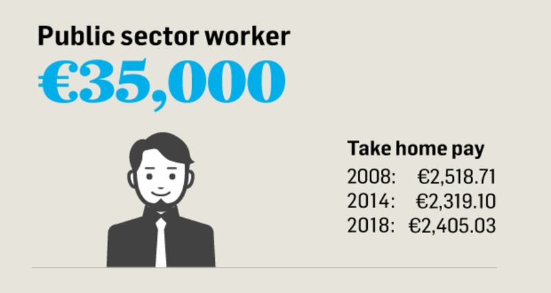 Losing €80 a month might not hit someone like our very high-earning couple, but, for our low-income single worker on €22,000 a year, it is a sizeable loss. A single worker on this salary is down by 4.6 per cent on their 2008 salary, although has recovered about €45 since 2014, so is almost halfway back to clawing back the losses.