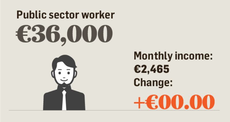 This is the situation facing our single public sector worker Tom. With earnings of €36,000 a year, he is on the precipice of the higher rate tax band; and any increase in his wages means he will end up paying tax at 40 per cent on even more of his income, due to the failure to raise the band from €35,300.