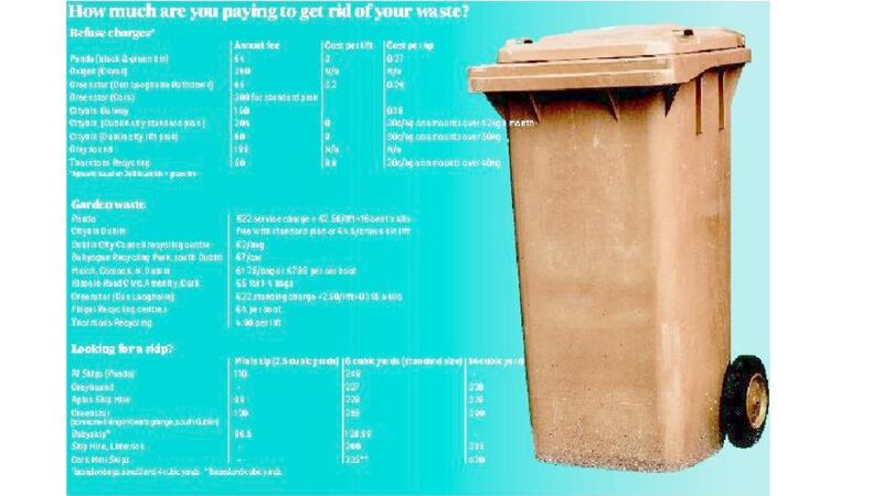For example, Panda imposes a service charge of €22 a year, plus €2.56 per lift and 16 cent a kilo for brown bin users. As an estimate, you could expect a refuse sack of grass clippings to weigh about 10kg. So, four such bags or one bin lift will cost about €9, plus the standing charge of €22 a year. A better deal then might be to load up your car – protecting it first by putting down some plastic sheeting – and bringing it to a recycling or garden waste centre. Dublin City Council recycling centre will charge you €2 a bag, or in Cork, you'll pay €5 for up to four bags at Kinsale Road Civic Amenity.
