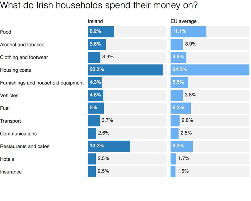 While we might have a reputation for being flahulach, Irish households actually spend less than EU averages in a number of areas. When it comes to food for example, we spend just 8.2 per cent, below the EU average of 11.1 per cent, while we also spend less on clothes and footwear (3.9% v4.9%); furnishings (4.3%v5.5%); and fuel (5% v 6.3%).