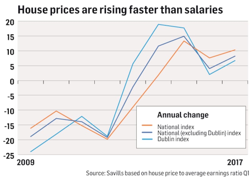 As data based on house price to average earnings compiled by property group Savills shows, the index was negative between 2009 and 2013 as house prices continued to fall. Since then, however, house prices have rebounded as earnings inch upwards. In the first quarter of the year, the house price to earnings ratio advanced by almost 7 per cent in Dublin, and by as much as 10 per cent nationally, when Dublin isn’t included.