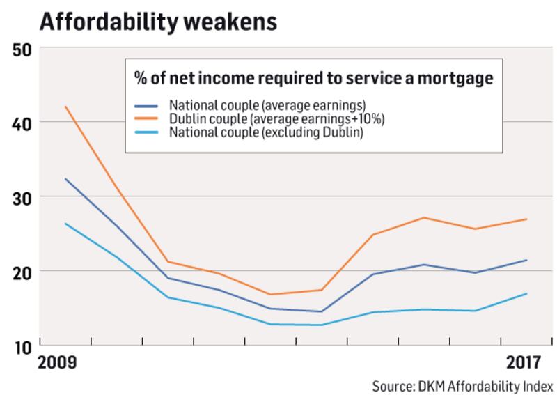In Dublin, affordability is tighter – down from a high of 42 per cent in 2007, but rising again at 26.9 per cent, which puts it close the preferred debt service ratio. The least affordable area for first-time buyers is Dún Laoghaire Rathdown, where it takes almost 34 per cent of after-tax income to pay the mortgage.
