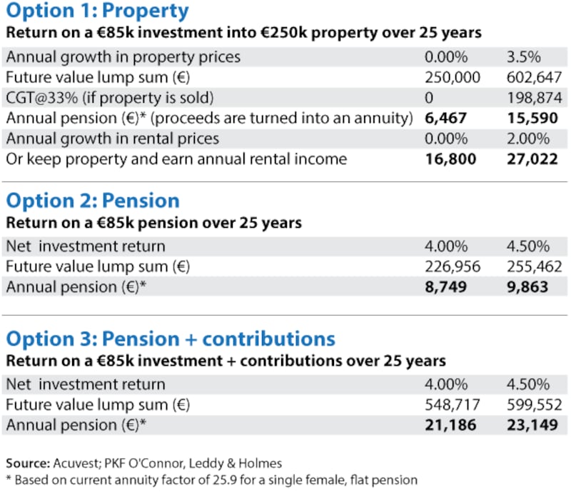 As Tuohy sees it, and as the table shows, the property has the best “potential” to turn your €85,000 into a larger sum and offer the best returns in retirement.