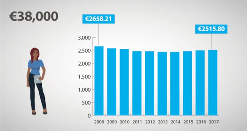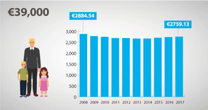Well, our single father, Arthur, is in his late 30s and earning €39,000 a year. His take-home pay has dropped 4.3 per cent since 2008, while his tax burden, or his effective tax rate, has risen more than almost everyone else, up from 11.3 per cent back in 2008 to 15.1 per cent in 2017.