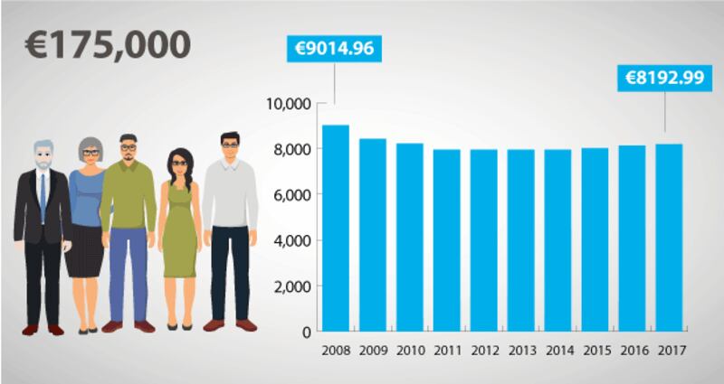 Sam, with income of €175,000, has seen his take-home income slip 9 per cent since 2008, and he is still down about €800 a month, thanks to the steady rise in taxes on those on middle and higher incomes, as well as on landlords. Being self-employed doesn’t help either, as he must pay a three percentage point USC surcharge on earnings over €100,000.