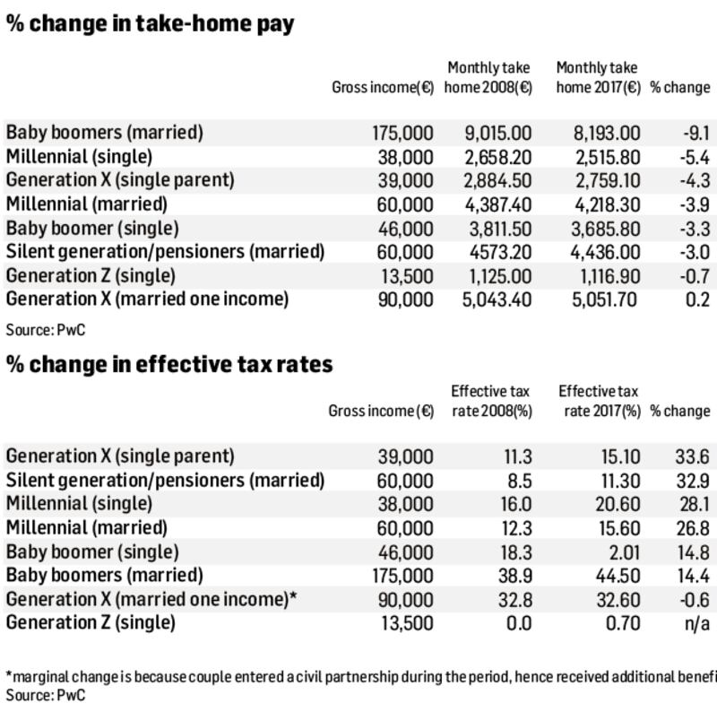 If she had been earning the same income back in 2008, she would have got to keep €2,658 of her monthly salary. That’s one of the biggest falls in after-tax income of any of the generations, at 5.4 per cent. Moreover, her effective tax rate has soared by 28.1 per cent since 2008, again one of the highest rates.