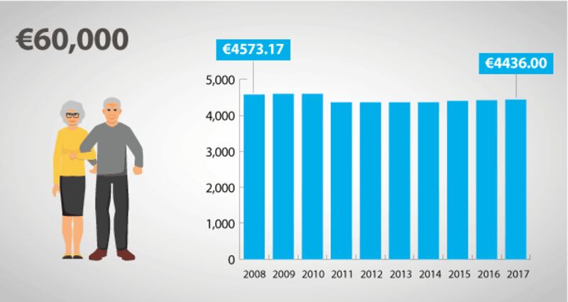 As our figures show, Jack and Bridie, on an income of €60,000, including an occupational and two State pensions, took home €4,573 a month back in 2008; this year it’s €4,436, down €137.