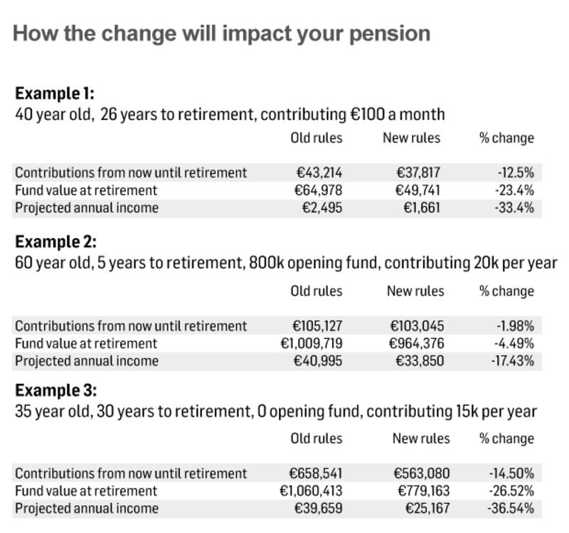 Alex is 40, and contributes €100 a month into his pension, with a planned retirement age of 66. Under the old rules, he was projected to have a fund worth almost €65,000 at retirement, giving an income of €2,495 a year. Under the new rules, however, his income has been slashed by 33.4 per cent, with a projected pension fund of just €49,741, and income of €1,661.
