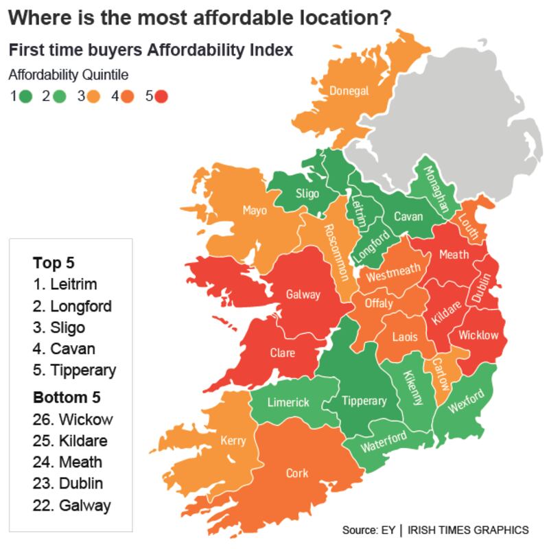 In terms of saving for a deposit, the most affordable counties for first-time buyers are Leitrim, where it would take just 1.3 years to save enough for a home; Waterford (1.6 years), Sligo (1.6 years), Cavan (1.7 years) and Longford (1.9 years).