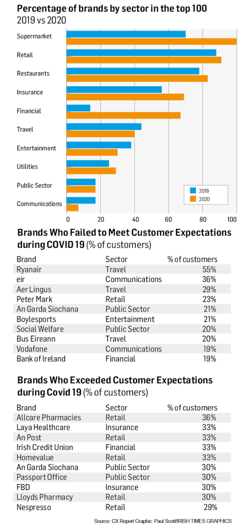 A new report shows many businesses going above and beyond during the pandemic. However, telcos, transportation companies, online retailers and delivery services all performed badly in terms of meeting customer expectations.