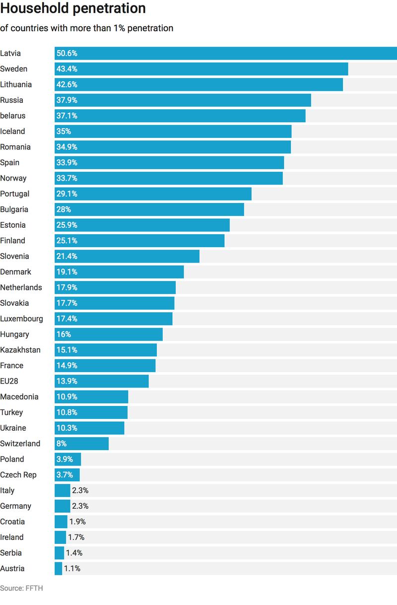 The Scandinavian/Baltic countries continue to lead the way in terms of the take-up of fibre broadband in Europe with Latvia, Sweden and Lithuania retaining the top three positions.
