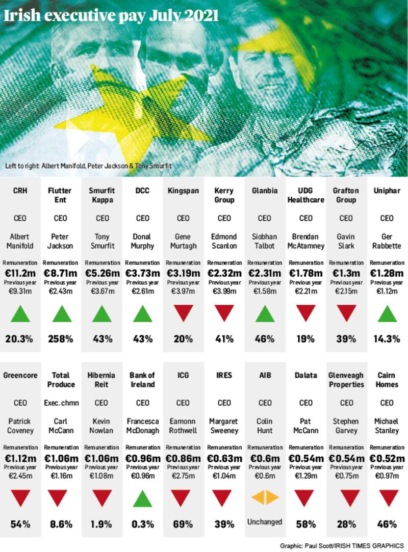 The figures include CEOs of companies listed on the Iseq 20 index in Dublin and four Irish companies on the FTSE 350 in London, but they exclude Ryanair, which has not yet published its annual report for 2020.