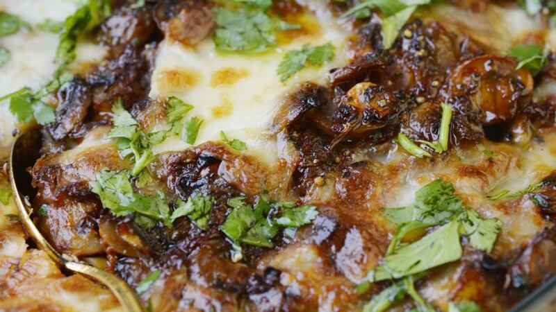 Place the lasagne sheets on top, and then add all of the mushroom mix on top of that. Finally, dot the remaining cheeses all over the top and bake for 30-40 minutes.