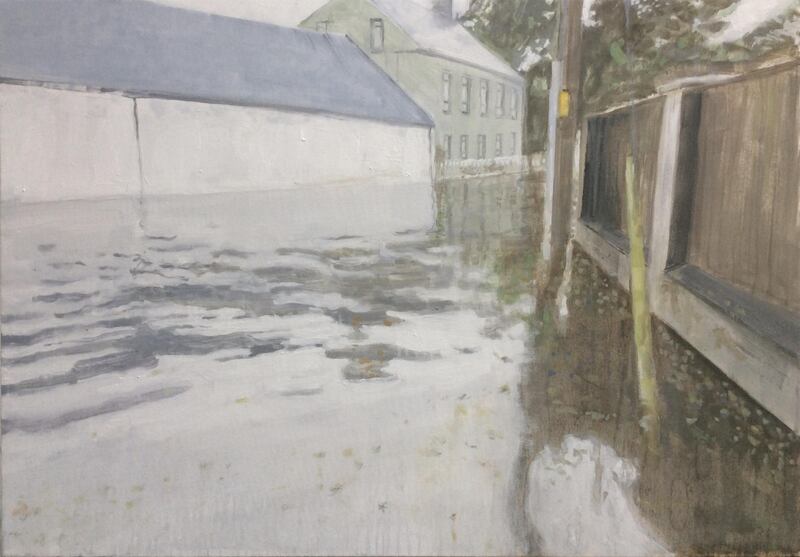 Flooded (2017) is one of a recent series of paintings by Bernadette Kiely that take the flooded landscape as their subject. They are a continuation of her long-term preoccupations rather than a response to recent flooding in Ireland. As it happens, the flooded landscape is ideally suited to her interest in conditions that veil what we are looking at and make us think again: blankets of mist, fog, or, in this case, floodwater.