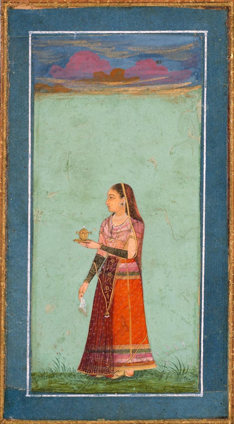 It is not that typical in featuring a single female subject, but it displays the typical strengths of Mughal painting, from the finely drawn profile to the wealth of careful, naturalistic detail, not to mention the sensitive use of colour. Linda York Leach noted that the distinctive, melon-shaped cup the woman carries is a close match to vessels known to have been in use at court during the reigns of Jahangir and Shah Jahan.