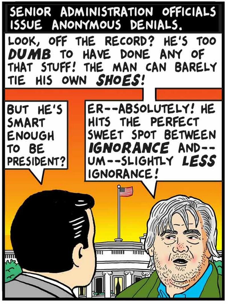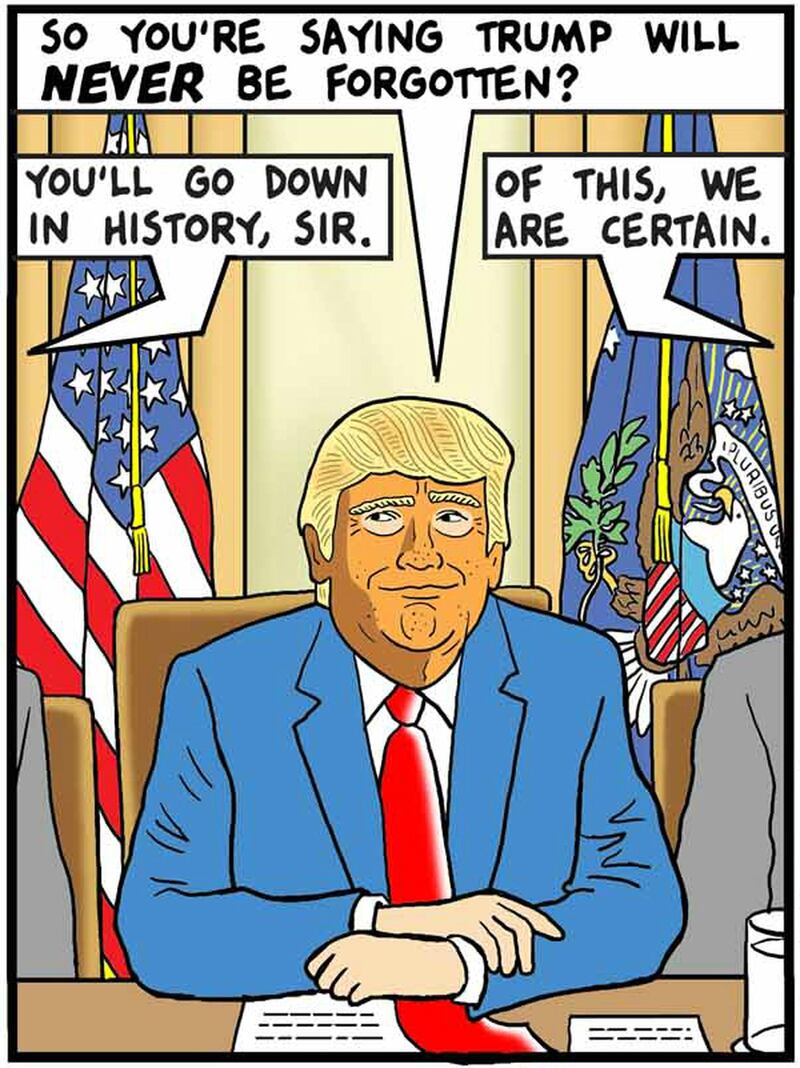 He sighs. “And now we’re in an entirely different political situation . . . For a while I was on Pacific time and it was kind of exhausting because I would wake up at 7. . . and the first thing I’d see was what idiotic nonsense Trump had already been tweeting for three hours. At the end of the year for 10 years, I’ve been doing these year-in-review cartoons. I can’t do that with Trump. I’d get two days into the year and have no space left. Someone said that he’s like a ‘direct denial of service’ attack on democracy. He’s definitely a DDoS attack on satire.”