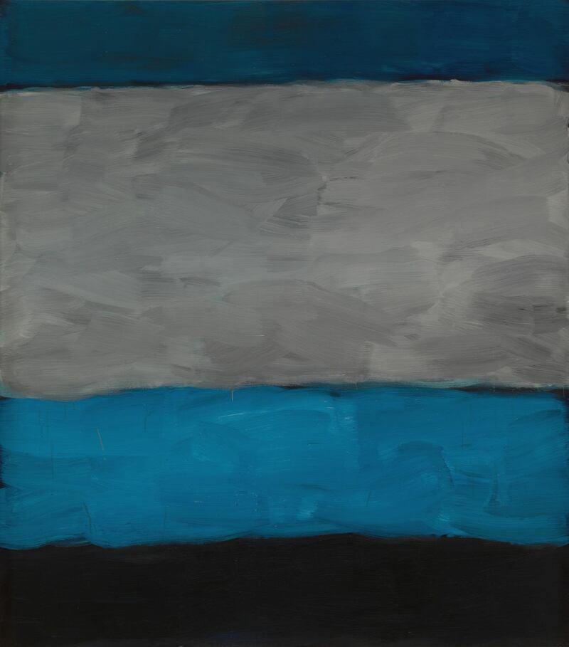 It’s painted in a traditional medium, oil paint, but on aluminium rather than canvas or wood. Artists have long painted on metal, but it is still relatively unusual as a support. When Scully started painting on aluminium panel, he liked the fact that it was a faster, less yielding surface. It could be that he likes the resistance of the aluminium to the emotional charge of his painting. It is, he said, “unsentimental”, and plays against the implicit romanticism of his style, generating a useful, lively tension. While the horizontal bands of colour have an atmospheric tonality and point to landscape – land, sea and sky – they are to all intents and purposes abstract with, as he puts it, “a faint memory of minimalism” about them.