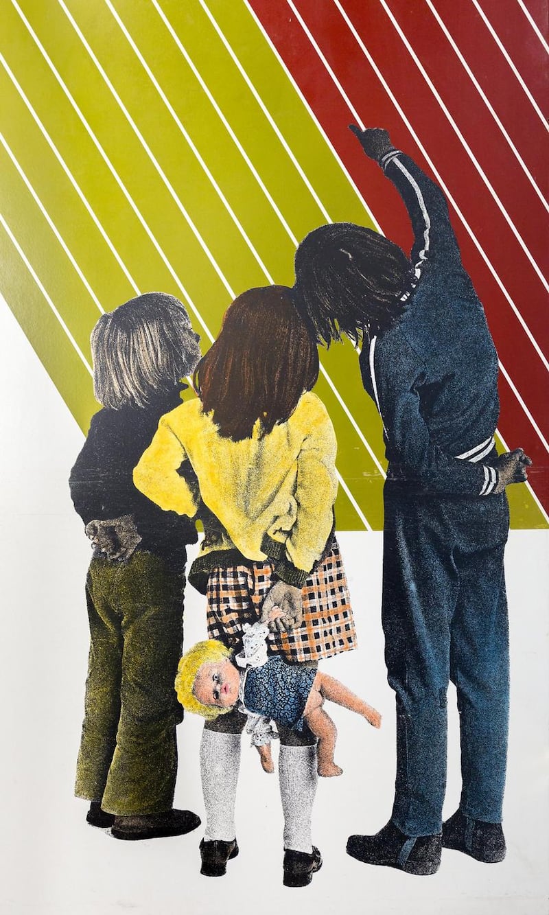 At the time, Ballagh had only recently embarked on his artistic career when he landed this first big commission. It was daunting: some 18 panels for the Five Star Shopping Centre in Clonmel. He felt that his People Looking at Paintings series, which formed a landmark exhibition for him at the David Hendriks Gallery in 1972, would be appropriate and could be effectively adapted to the project. He had not come from a fine art academic background, and at the time was acquiring technical skills. The pop art practice, most closely associated with Andy Warhol, of using photographic silkscreen imagery, was ideal for him. For his early People Looking at Paintings he produced silkscreened photographic images (and later painted images), of fashionably attired individuals looking at simplified representations of prominent artworks (he had previously made a very popular series of such representations). For Clonmel, he made tinted photo-silkscreen images of a number of people looking at a Frank Stella abstract painting consisting of flat diagonal band of colour. The panels are finished with a durable Formica laminate.