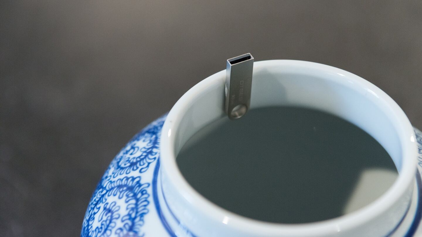 A number of decoratively glazed ceramic vases are distributed throughout the centre of the floor space in between the structural pillars. This looks really good, though the vulnerability of the installation might unsettle any curator. The title is This is Water. A USB memory stick is attached inside the rim of each vase. Presumably Mayhew sees a memory stick as a container, just as a vase is a container. In each case the vessel is a springboard to variable content.