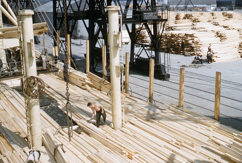 Within this archive is a small collection of colour slides dating from the 1950s and 1960s. They are mostly of shipping and port operations just prior to modernisation of the shipping industry. Soon afterwards the shipping container, invented by American transport entrepreneur Malcolm McLean in 1956, would change both the lives of dock workers and the environment they worked in. In the following two decades much of Dublin’s docks became industrial wastelands; containerised shipping required new ports and less labour.
