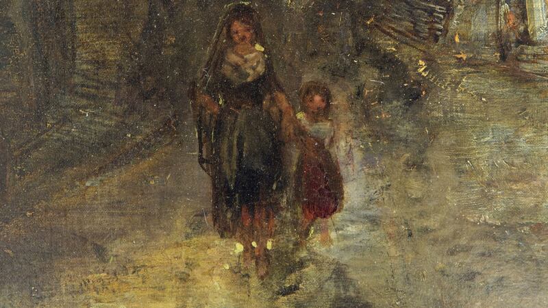 If hunger, disease and death were too much for art, the depiction of eviction and emigration just about fitted into the new radical ordinance. Between 1846 and 1853 more than half a million people were evicted. Eviction for most meant the workhouse, or a lingering death in or by a ditch. For others, the exodus informed the genre of quayside scenes, and allowed for narrative amplification: nostalgia for the past and/or hope for the future.