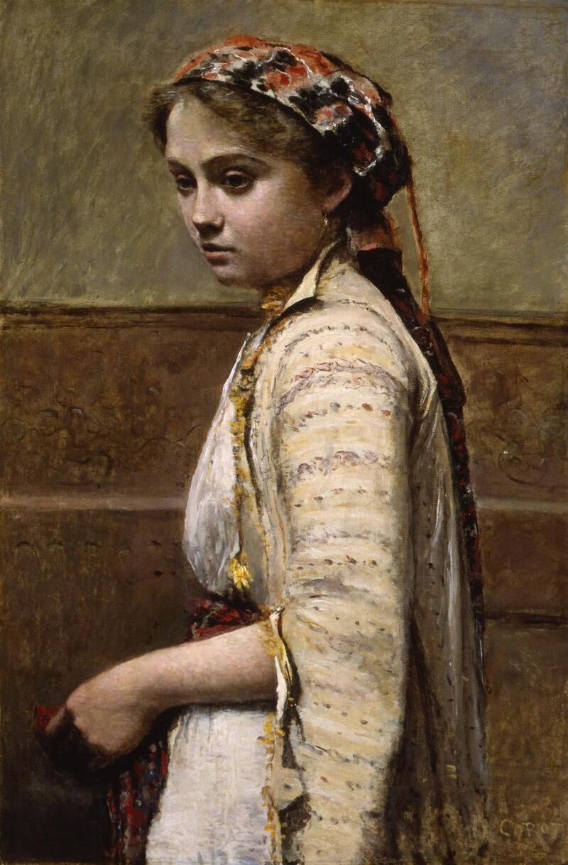 Corot dressed models in Greek or Italian costume and infused them with mystery and melancholy. He borrowed from art history the themes of women fetching water at fountains, reading, or playing musical instruments.