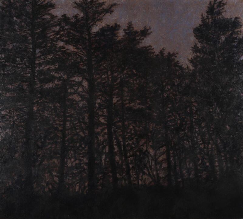 As with the conté drawings, they are individual pieces and, again as with the drawings, they work incredibly well as an ensemble. Also on view are a number of paintings of sections of the landscape, mostly trees, sometimes silhouetted against the sky, always perfectly judged.