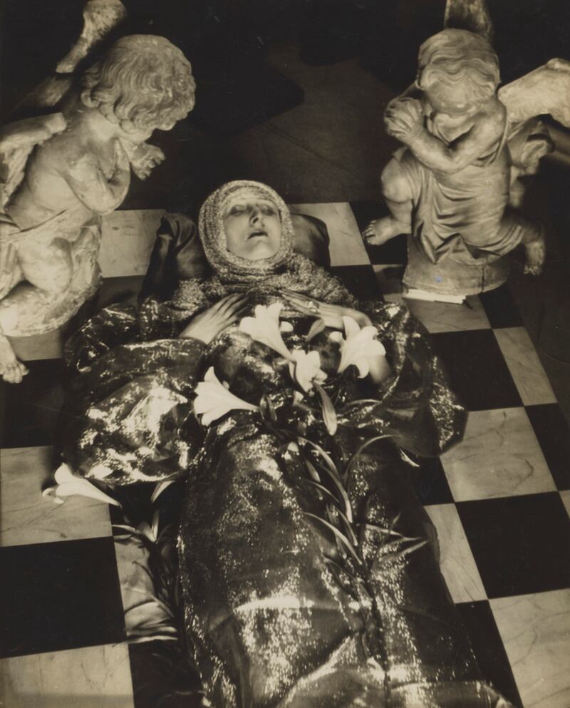 Striking images in this show include portraits of his younger sister Baba as Heloise in the Great Love Pageant, Oliver Messel resplendent in a feathered head-dress and trident, Maxine Freeman in an astonishing head-dress and flower strewn dress and Edith Sitwell portrayed as a medieval corpse adorned with white lilies and guarded by stone cherubs. There are also glimpses of the high-spirited parties and picnics at country house weekends that the group adored. A famous example is the photo featuring leading lights of the set costumed as 18th century shepherds and shepherdesses celebrating a Fête Champètre at Wilsford Manor, now regarded as the quintessential image of the era.