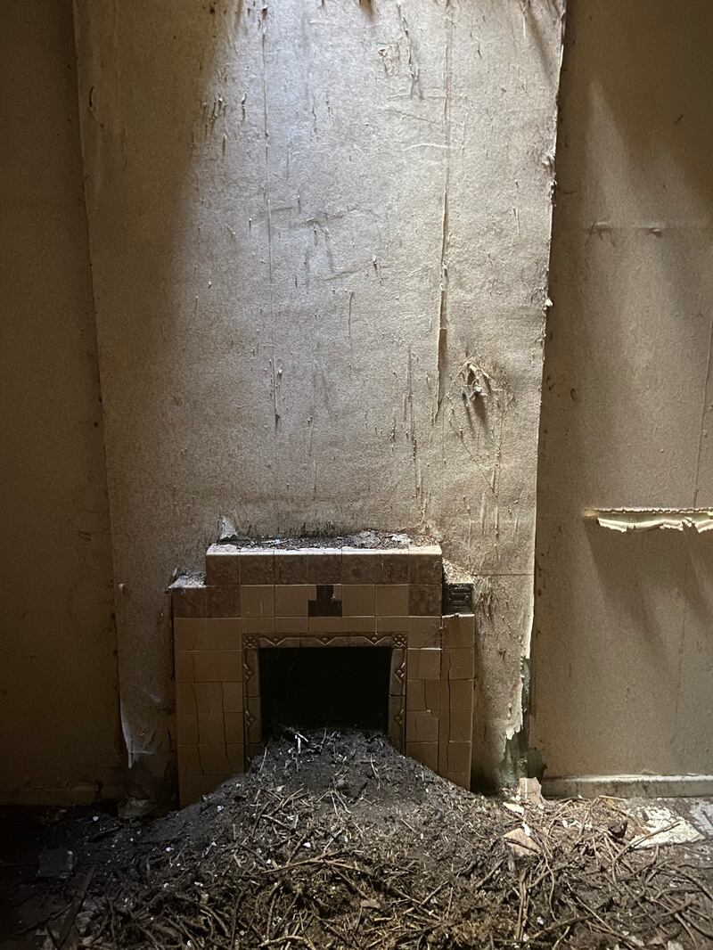 The house is a silenced witness to the needless damage done. There is some light from a hole in the roof and from our phones. Pigeons roost in the kitchen, where Kathleen retreated after being confronted by the gunmen at the front door, her daughters Eleanor and Mary sheltering behind a sofa, Declan passing her in the hall to see what the commotion was.