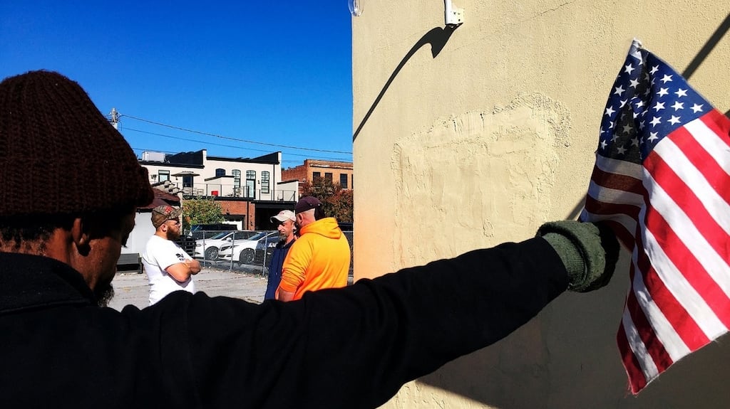 BD: I took a series of Greyhound buses around the Rust Belt; coal-mining towns decimated by unemployment, despair and opiates, and the heartland of where Trump’s election happened. On one occasion a bus pulled into Bristol, Virginia. We alighted for a cigarette, and during our break an anonymous traveller began waving his American flag. Was this an act of defiance or support?