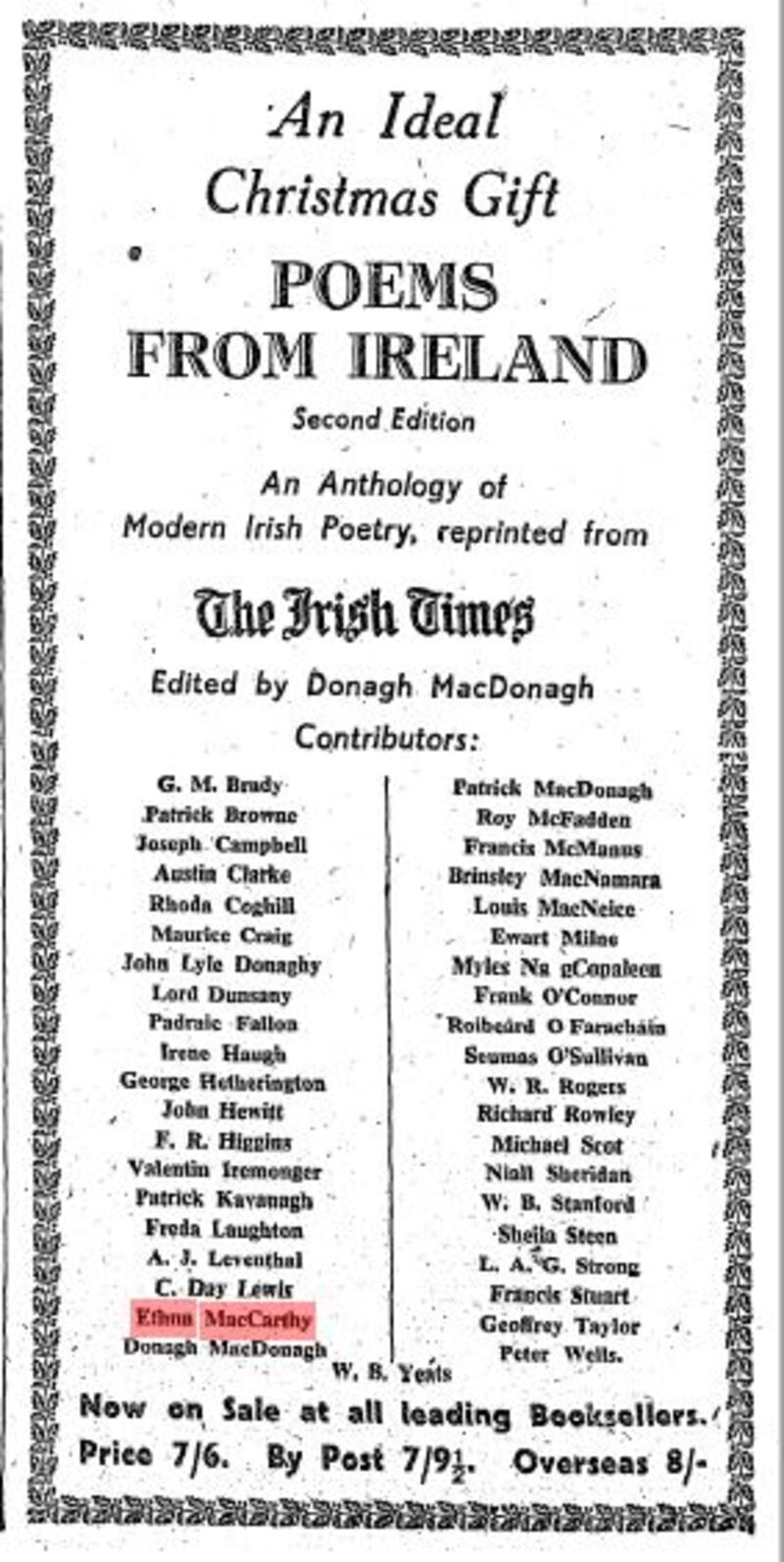 “Dr Ethna MacCarthy will be away from Desmond, Sandymount Avenue, Ballsbridge, for a few weeks”, the Social and Personal column of this newspaper announces in June 1946. Where she went, we do not know, but it is as tantalising in its wayward mystery as her own shimmering and shifting poems are. We do know that she is back in Dublin on May 11th, 1947 as the same newspaper lists her among the speakers at a PEN International debate on Fights in Literature, along with Blanaid Salkeld, Rosamond Jacob and AJ (Con) Leventhal.