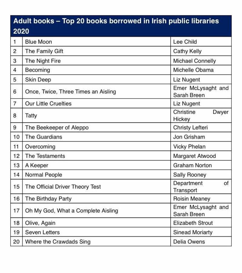 Blue Moon by Lee Child was the most borrowed book in Irish libraries last year. The Family Gift by Cathy Kelly (2nd) was the most popular Irish title but Liz Nugent features twice in the top 20, with Skin Deep (5th) and Our Little Cruelties (7th). So too do Emer McLysaght and Sarsah Breen with Once, Twice, Three Times an Aisling (6th); and Oh My God, what a Complete Aisling (17th). Becoming by Michelle Obama (4th) was the most popular nonfiction title, followed by Overcoming by Vicky Phelan (11th).