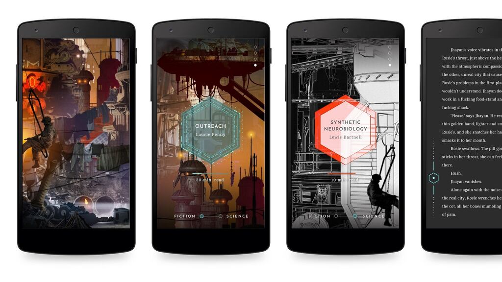 Strata is easy to navigate. Readers can determine the structure of their engagement by switching between science and fiction at any time, with hexagonal shapes on the left of the screen activating pop-up illustrations.