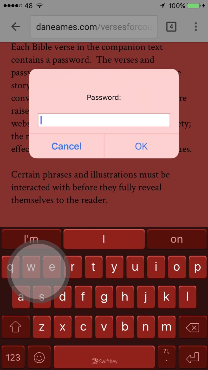 Challenges were met in combining the visual language of religious texts with mobile web pages, and incorporating technological cues into traditional, religious media. The 60 years of societal change are reflected in the dialogue between the different components. The colour scheme, typefaces and initial appearance of the piece moves from the 1950s into the present, while the screen elements, digital passwords and coded web elements look back from the present day, towards the era of The Country Girls. Quotations, taken directly from O'Brien's classic and the Bible, have been dissected and curated to allow the reader to make their own personal connections to other issues beyond this piece.