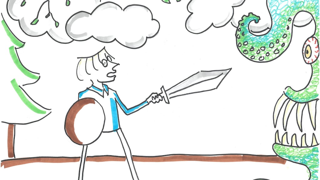 In the magical realm, there was one very scary monster that could shape-shift into your worst fear. It was the scariest monster in the realm and it was called Jimbob. Timmy has a sword and a shield and he cut open the door of the portal with his sword.