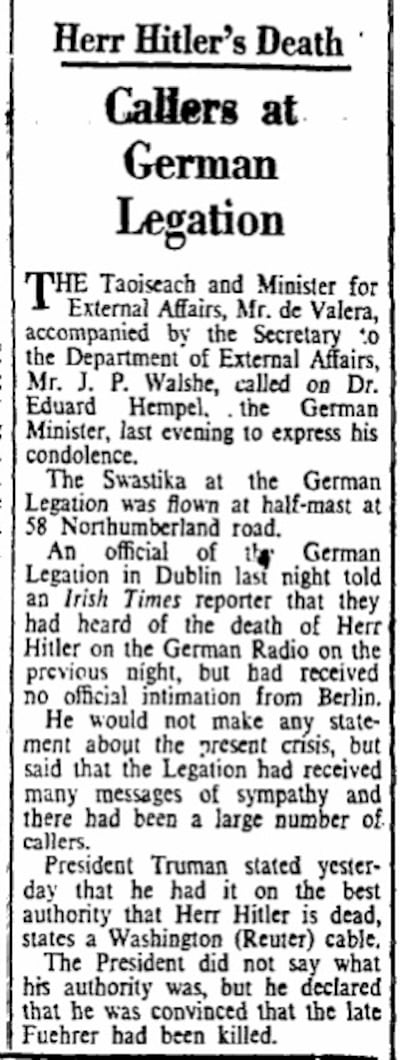 A phantom hangs over Ireland’s relations with Hitler’s Germany. Since Eamon de Valera’s visit to the Third Reich’s minister to Ireland on 2 May 1945, the spectre of pro-Nazism has dogged Ireland’s reputation. De Valera’s condolences on the suicide of the German head of state, Adolf Hitler, spawned immediate international condemnation. He gifted his critics all the ammunition that they desired to stigmatise Ireland.