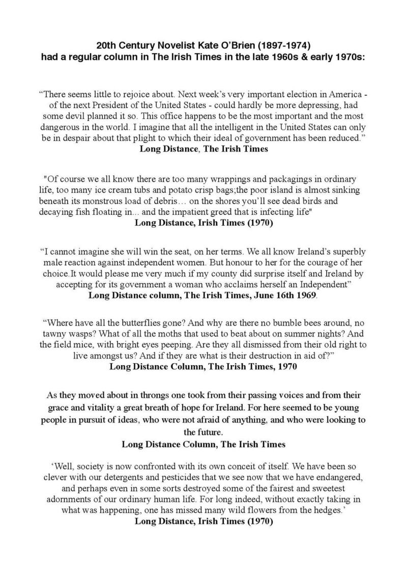 “When all you good citizens of Ireland are reading your Irish Times this morning, you certainly will not have time or attention to give to me. You will be busy with the comedies, farces and savageries of your General Election” – Long Distance by Kate O’Brien, June 16th, 1969