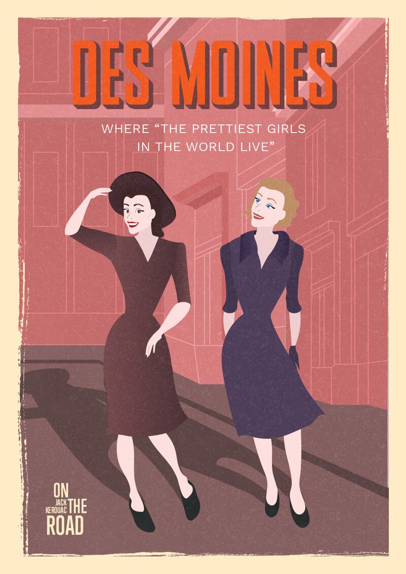 The gloomy old inn over the smoky rail yard where Sal winds up in Des Moines is soon forgotten after his attention is stolen by the “beautiful bevies of girls everywhere”, bringing him to declare that “the prettiest girls in the world live in Des Moines”.