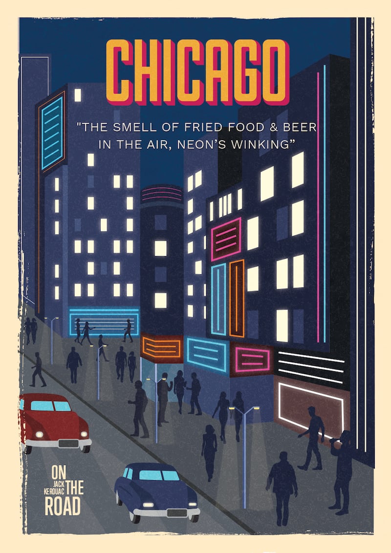 Pulling into Chicago at the wheel of a borrowed Cadillac, Sal and Dean cruise from bars to clubs in search of thrills. Part of their time is spent in the historic Loop District, that consists of “screeching trolleys, newsboys, gals cutting by, the smell of fried food and beer in the air, neons winking”.