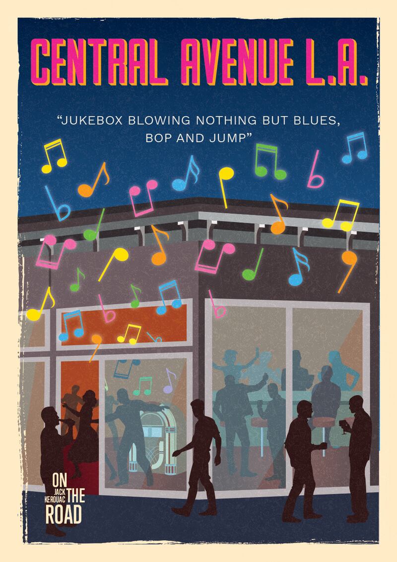 Led by the hand of his girlfriend, Terry, to the tune of local jump blues bands, Sal enjoys a stroll down Central Avenue “which is the colored main drag of L.A. And what a wild place it is, with chickenshacks barely big enough to house a jukebox and the jukebox blowing nothing but blues, bop and jump.”