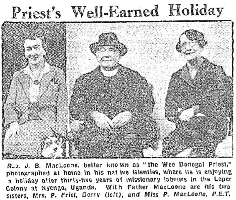 From 1934 through to the mid-1940s, the Derry Journal regularly carried letters from a leper camp in Nyenga, Uganda. The letter writer was Fr Barney MacLoone of Glenties, Co Donegal, who had left for Africa immediately after his ordination as a Mill Hill Missionary in 1911.