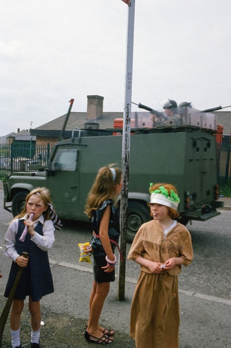 It is important to appreciate the wider context of the times and put these photographs into perspective. Northern Ireland has come a long way in the 35 years since they were taken. Few of these are posed photographs since in most of them local people are seen in their natural state. Some are dramatic action shots where Kazeni was clearly in medias res, unafraid of getting close to the action.