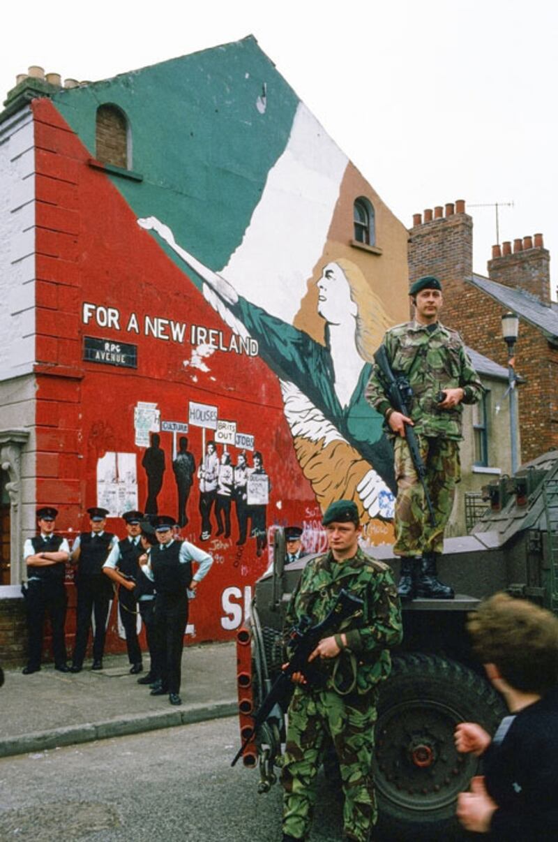 On one occasion, we drove to Crossmaglen in south Armagh, to what was then known as “bandit country” because of the dangers it presented for the British army and RUC. Soldiers with supplies were airlifted by helicopter in and out of army watchtowers, military installations and heavily fortified bases called sangers. Observation posts and lookout stations were scattered on many prominent mountain tops, and a primeval atmosphere lurked in these low hills and fields. With the huge security presence and a serious terrorist threat an everyday reality, this was what might be classified as a press photographer’s “dream” place. It was not safe for anyone to walk the roads since the army kept all movements by locals under constant surveillance and a landmine could have exploded at any time.