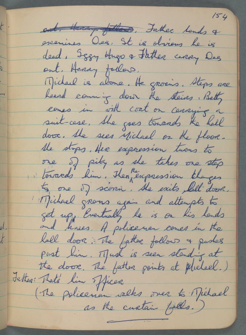 Marking the significant contribution that the playwright has made to Irish theatre, an online exhibition has also been mounted by the library, Tom Murphy: a Life in the Theatre. This online exhibition curated by Grene and Liam Harrison, traces the genesis of Murphy’s work from his life as a young man in Tuam (memories of which feature so frequently in his plays), the imaginative development of his plays through the writing process, his engagement with staging and production by the Abbey and Druid Theatre Company. Featured in the exhibition are draft manuscripts, a range of photographs of productions, and of the playwright himself from an early appearance as Christy Mahon in The Playboy in the Tuam Little Theatre Guild through to the conferral of the gold torc of the Saoi by President Higgins. There are also especially commissioned interviews on Murphy’s work by Garry Hynes, Fintan O’Toole and Colm Tóibín.