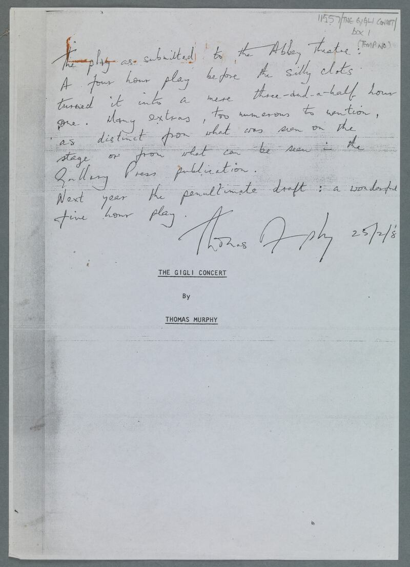 It is a very special collection as it also includes the original typed script of The Gigli Concert from 1983. This had previously been given by the playwright as a 21rst birthday gift to his son Bennan Murphy, who has generously returned it to the collection.