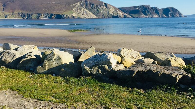 Galway didn’t relent when it came to rain during those days earlier this year when we padded the streets recording. By the time we hit the road for Mayo, the weather changed. Sun came out as we entered Westport, wonderful, busy, Westport. But how could one ever forget the trip into Achill itself: was this a summer’s day. A pet day, or what?
