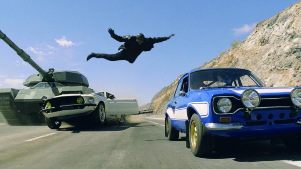 Forget cars. These days Vin Diesel’s crew are going to war against supertanks and military air carriers and something that looks like the Batmobile. Forget polite introductions: recurring characters arrive with handy cut-out-and-keep guides: Tyrese Gibson shows up in a private plane bearing the legend “It’s Roman, bitches”; The Rock, an ill-defined law enforcer who spent the last movie hunting the crew, is now a close enough confidant and unofficial team player to have earned the nickname Samoan Thor.