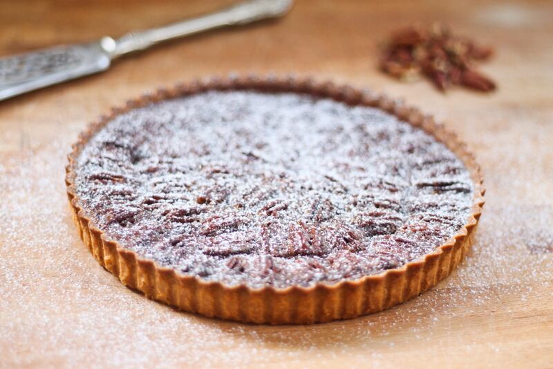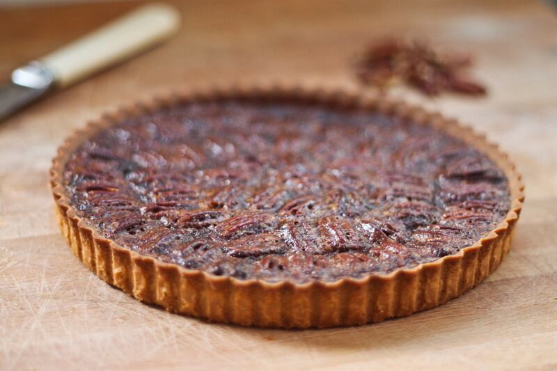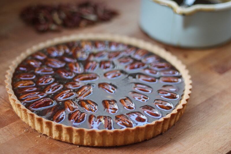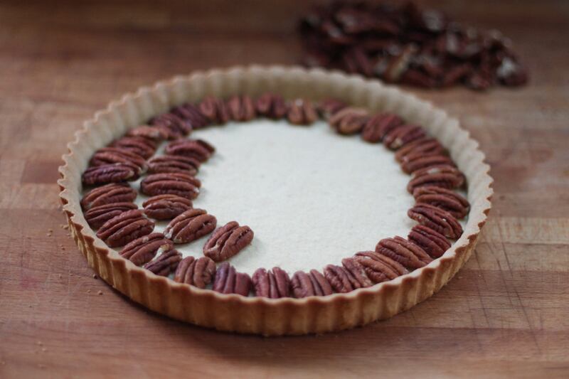 Line the pastry case with pecans before carefully pouring over the syrup mixture. Bake for 40 to 50 minutes until the filling is dark brown. It will still be a bit soft but it will set once cooled.