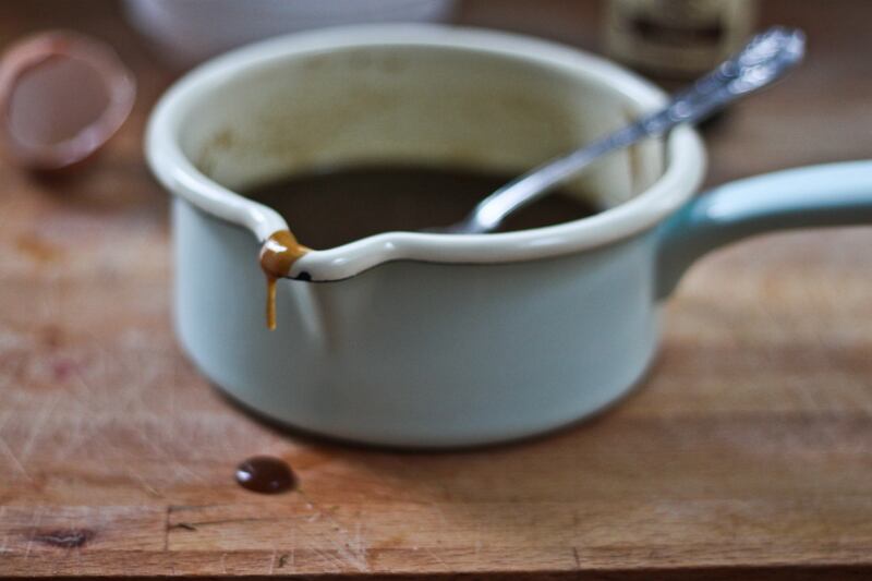 Preheat your oven to 180C/160C fan/Gas 4. Put the butter into a heavy-bottomed saucepan and melt over a low heat. Mix in the golden syrup and vanilla extract. When the butter has melted, add in the muscovado sugar and mix until thick and well-dissolved. Remove from the heat and allow to cool for five to 10 minutes. Beat the two eggs in a small bowl before mixing into the cooled syrup mixture.