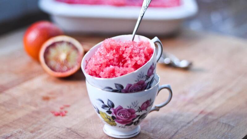 Squeeze the juice from the blood oranges. You want around 500ml of fresh juice. Blend the juice with the sugar and water mix. Pour it into a freeezer-friendly baking dish (22cm x 30cm is a good size as you want the surface area to be large to ensure quick freezing) and put into the freezer for one hour.